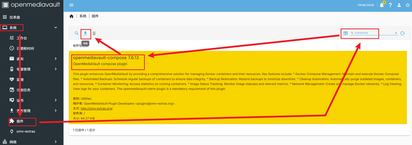 进入菜单,系统->插件:搜索compose关键词,找到openmediavault-compose,安装。